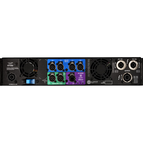 Onboard OMNIDRIVEHD DSP processing is built-in and uses 24-bit / 192kHz Cirrus Logic A/D and D/A converters, along with FIR and IIR filters for a high level of audio performance. A front-panel USB port allows you to easily transfer DSP settings from a computer to the amplifier. For connection to virtually any sound system, the amp sports analog and digital XLR inputs and outputs, as well as Speakon and Binding Post outputs. An Ethernet port supports TCP/IQ, HiQnet, and CobraNet, and is compatible with standard 100Mb Ethernet hardware.
